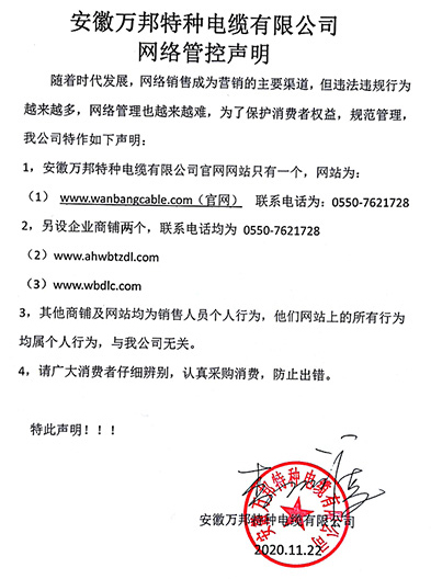 鄭重聲明:安徽萬邦特種電纜有限公司官方網站為:www_wanbangcable_com.zzz632.com,除此之外無任何子網站或合作網站,其余均為假冒偽劣。電話:0550-7621728 13485756353 地 址:安徽省天長市滁州高新技術產業開發區經四路29號